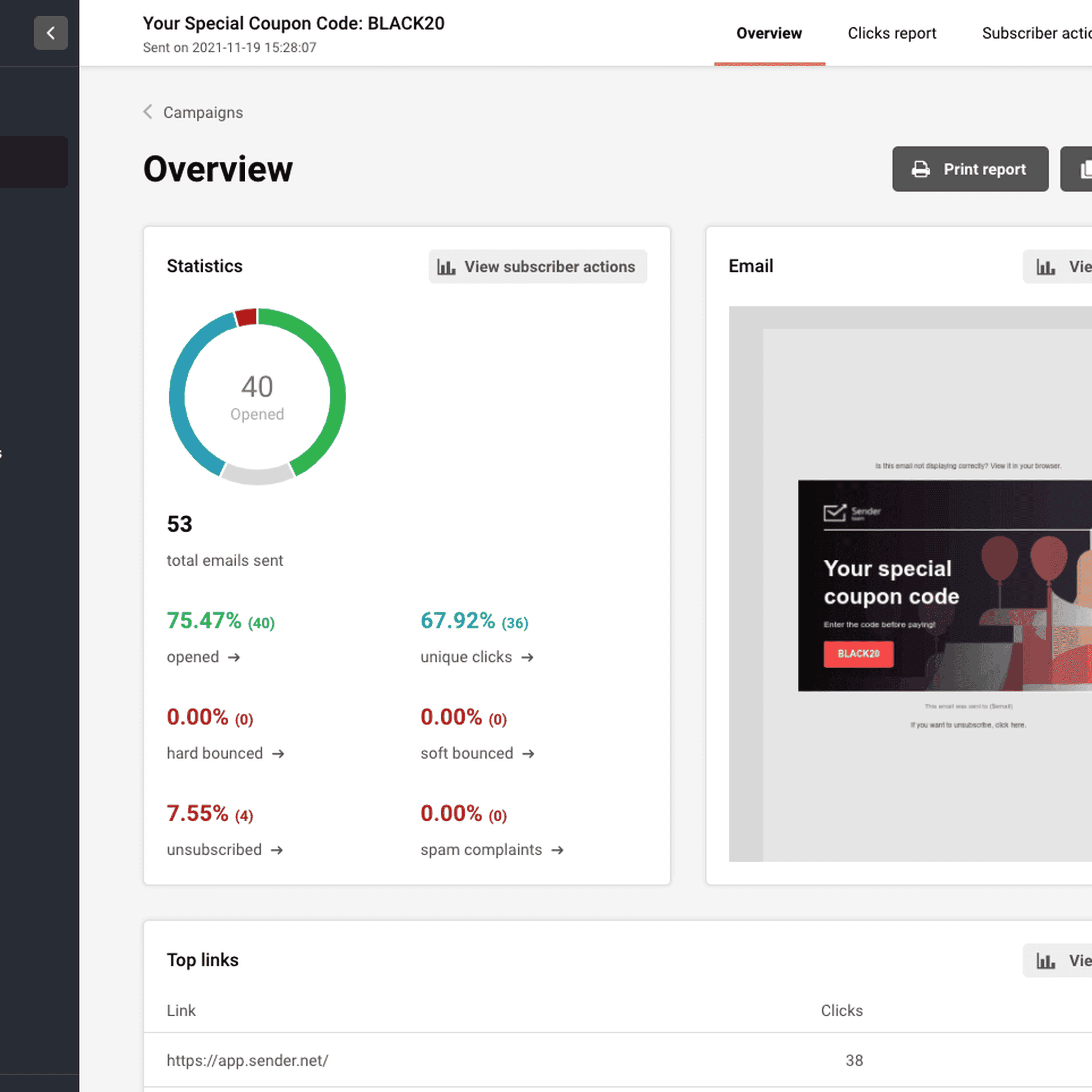 Verkrijg nauwkeurige en realtime statistieken bij elke e-mail die je hebt verstuurd. Volg eenvoudig het aantal gecreëerde leads, bestellingen, de gegenereerde inkomsten, je openingspercentage, bouncepercentage en doorklikpercentage. Verbeter je algemene marketingstrategie, volg de nieuwe kansen op en ga de verwachte inkomsten na.